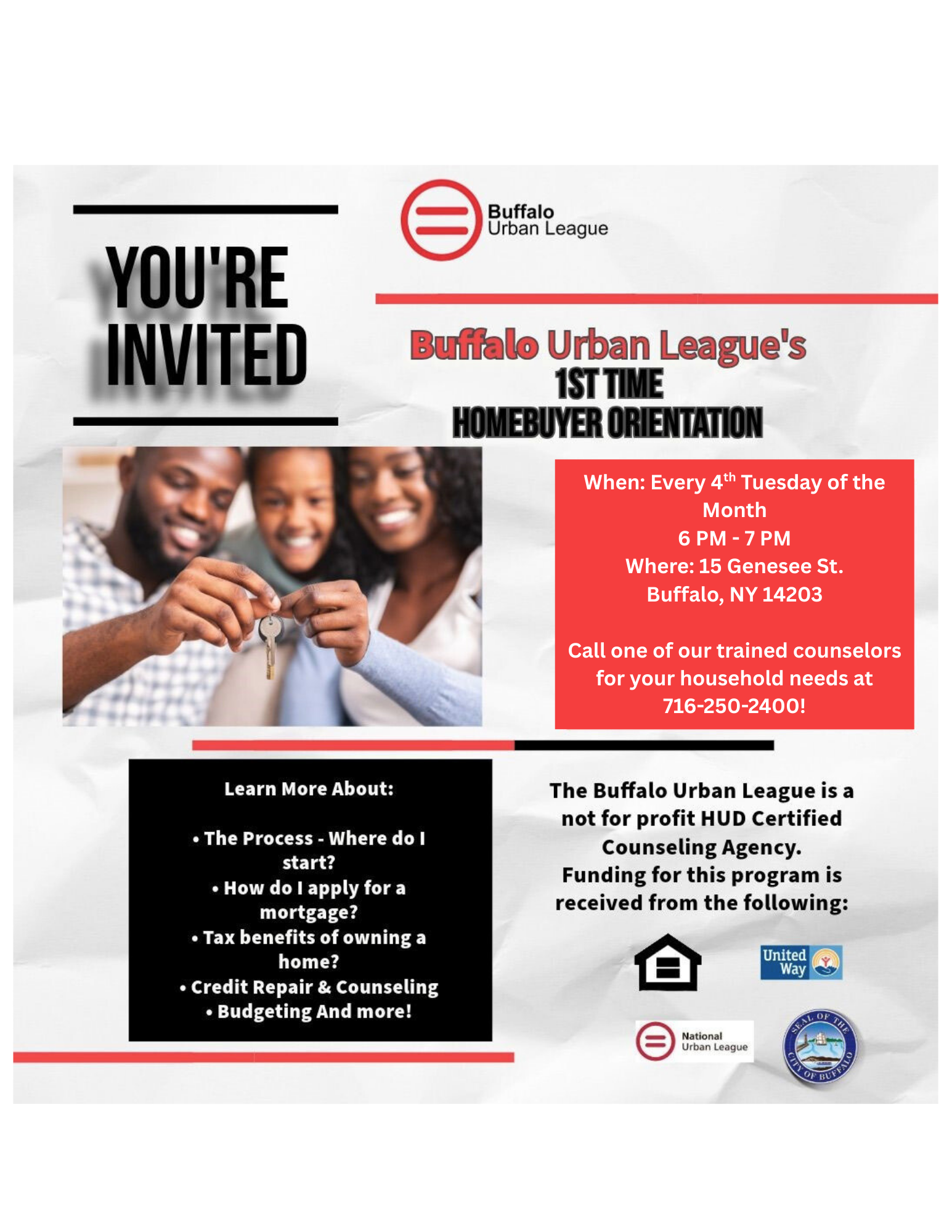 As the oldest HUD (U.S. Department of Housing and Urban Development) approved Housing Counseling Agency in Western New York, the Buffalo Urban League's Housing and Community Development (H&CD) Department delivers solutions by providing our neighbors with homeownership education, first-time homebuyer assistance, financial empowerment (budget and credit) coaching, foreclosure prevention counseling, predatory lending avoidance, affordable rental search coaching, fair housing education, and minority and women business loan and technical assistance.